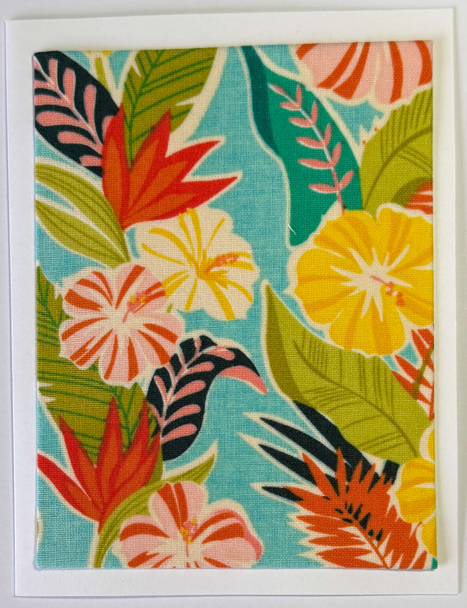 FabriCard. New Fabric. Hand-cropped. Fabric wrapped and mounted on white card stock. Frameable. Reusable. All occasion. Envelope. Blank, detachable message slip. Handcrafted in Hawai`i.
