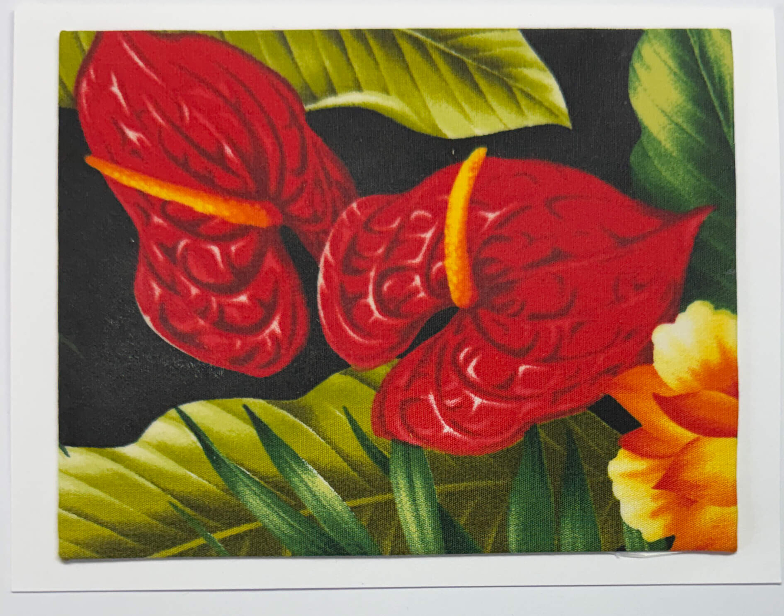 FabriCard. New Fabric. Hand-cropped. Fabric wrapped and mounted on white card stock. Frameable. Reusable. All occasion. Envelope. Blank, detachable message slip. Handcrafted in Hawai`i.