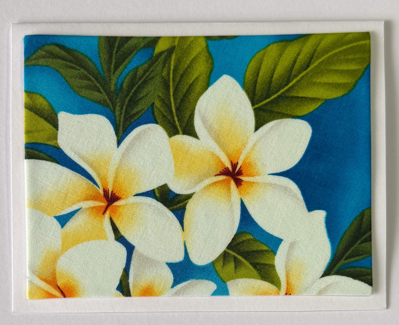 FabriCard. New Fabric. Hand-cropped. Fabric wrapped and mounted on white card stock. Frameable. Reusable. All occasion. Envelope. Blank, detachable message slip. Handcrafted in Hawai`i.