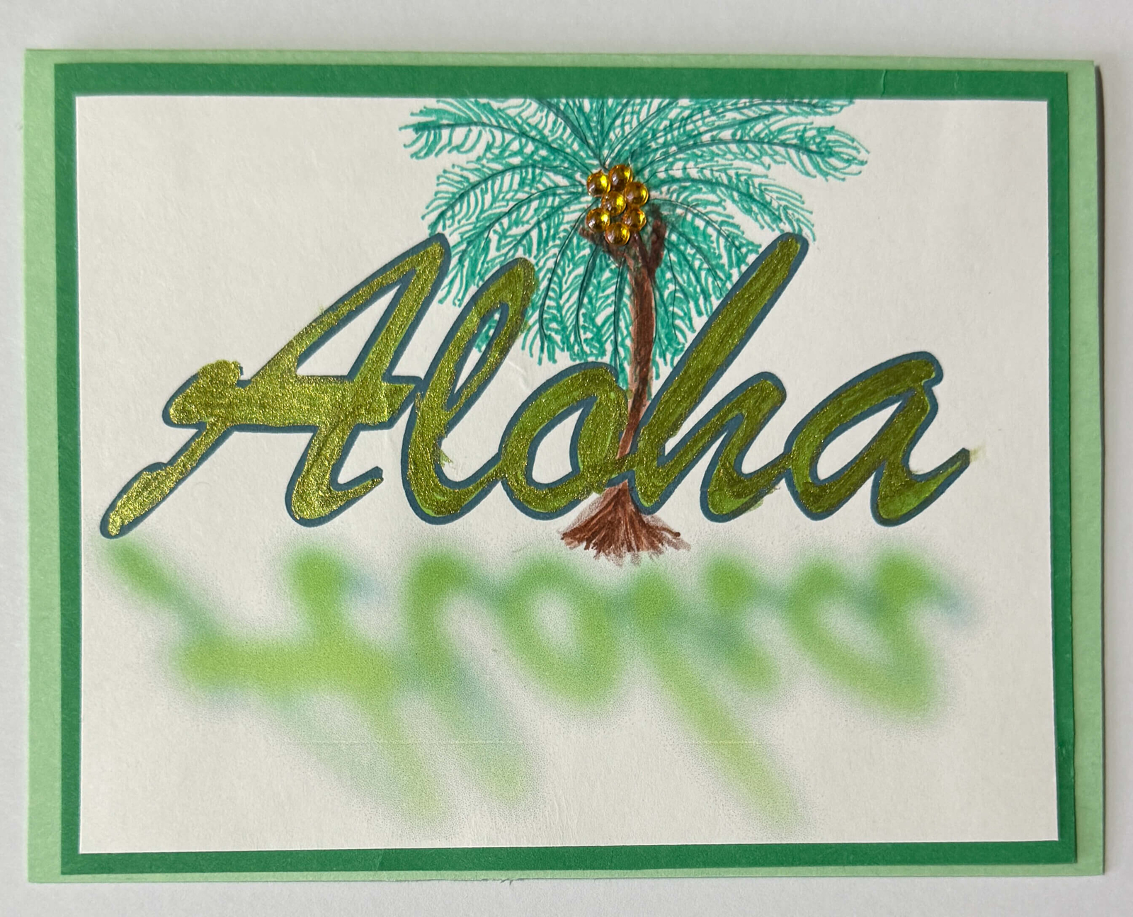 One of a Kind. Art Card. Aloha reflection. Printed words. Palm tree, rainbow, or lei design. Dimensional. Painted. Embellished. Mat. Frameable. Reusable. All occasion. Envelope. Blank, detachable message slip. Handcrafted in Hawai`i.
