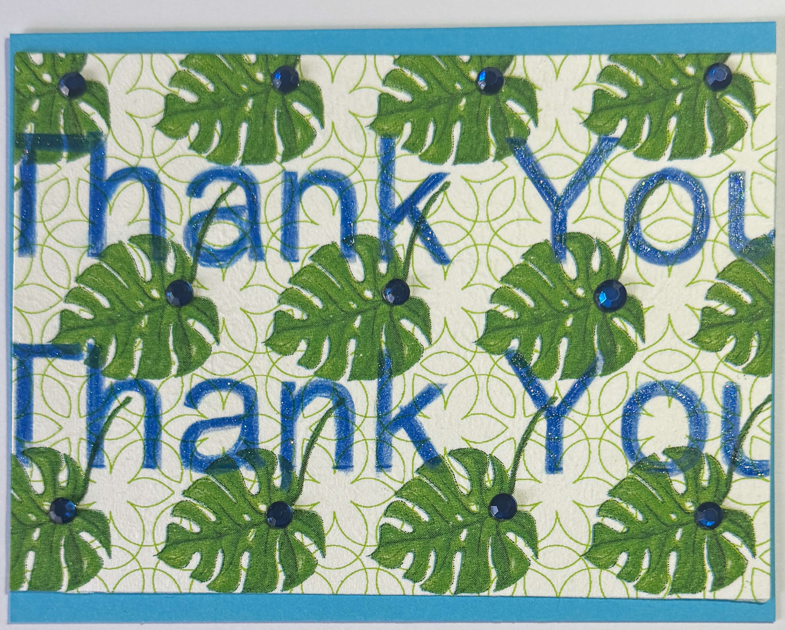 One of a Kind. Art card. Double Thanks Without Limits. Tissue overlay. Embellished, paint, colored pencil. . Dimensional. Frameable. Reusable. All occasion. Envelope. Blank, detachable message slip. Handcrafted in Hawai`i. (4.25" W x 5.5" H).