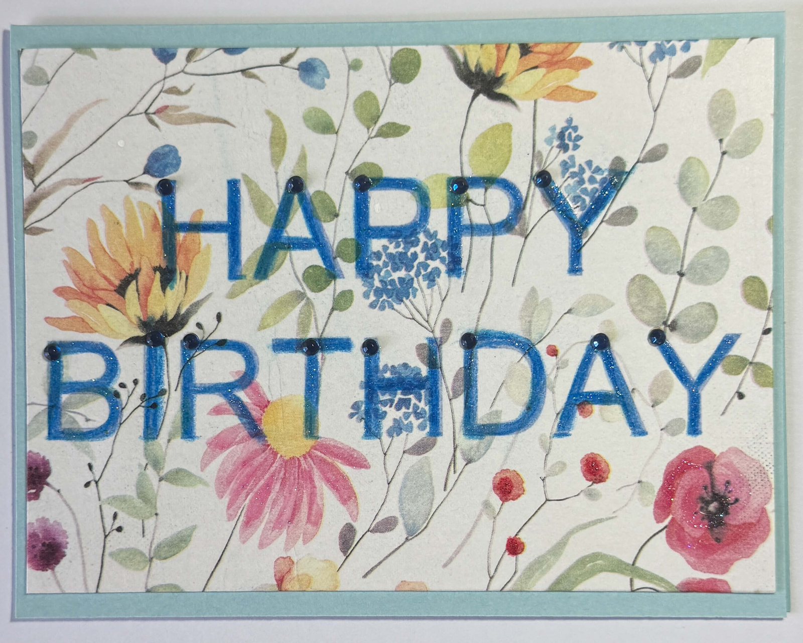 One of a Kind. Art card. Happy Birthday. Floral design. Embellished. Tissue overlay. Dimensional. Frameable. Reusable. Envelope. Blank, detachable message slip. Handcrafted in Hawai`i.