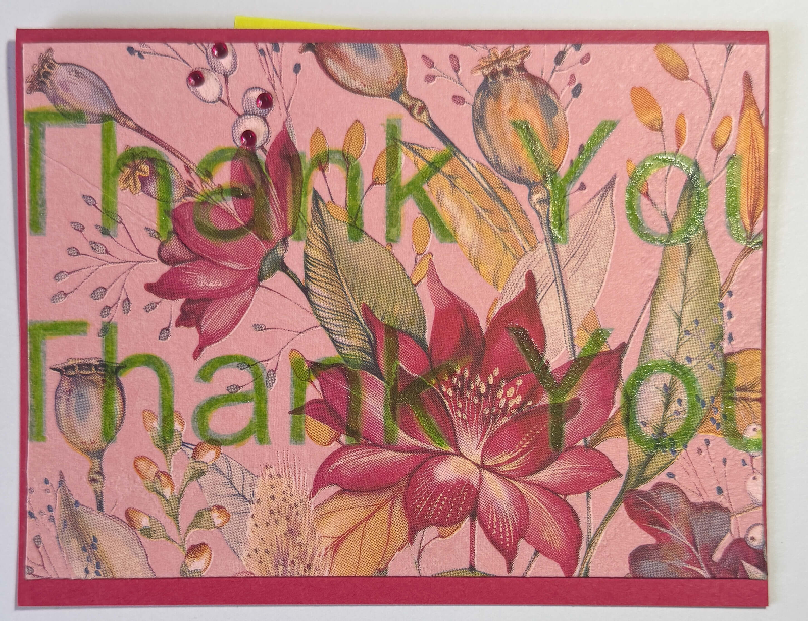 One of a Kind. Art card. Double Thanks Without Limits. Tissue overlay. Embellished, paint, colored pencil. . Dimensional. Frameable. Reusable. All occasion. Envelope. Blank, detachable message slip. Handcrafted in Hawai`i. (4.25" W x 5.5" H).