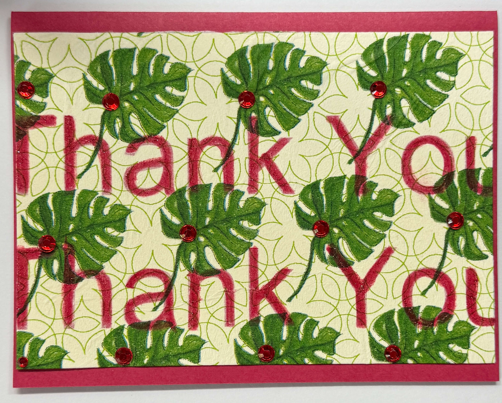 One of a Kind. Art card. Double Thanks Without Limits. Tissue overlay. Embellished, paint, colored pencil. . Dimensional. Frameable. Reusable. All occasion. Envelope. Blank, detachable message slip. Handcrafted in Hawai`i. (4.25" W x 5.5" H).