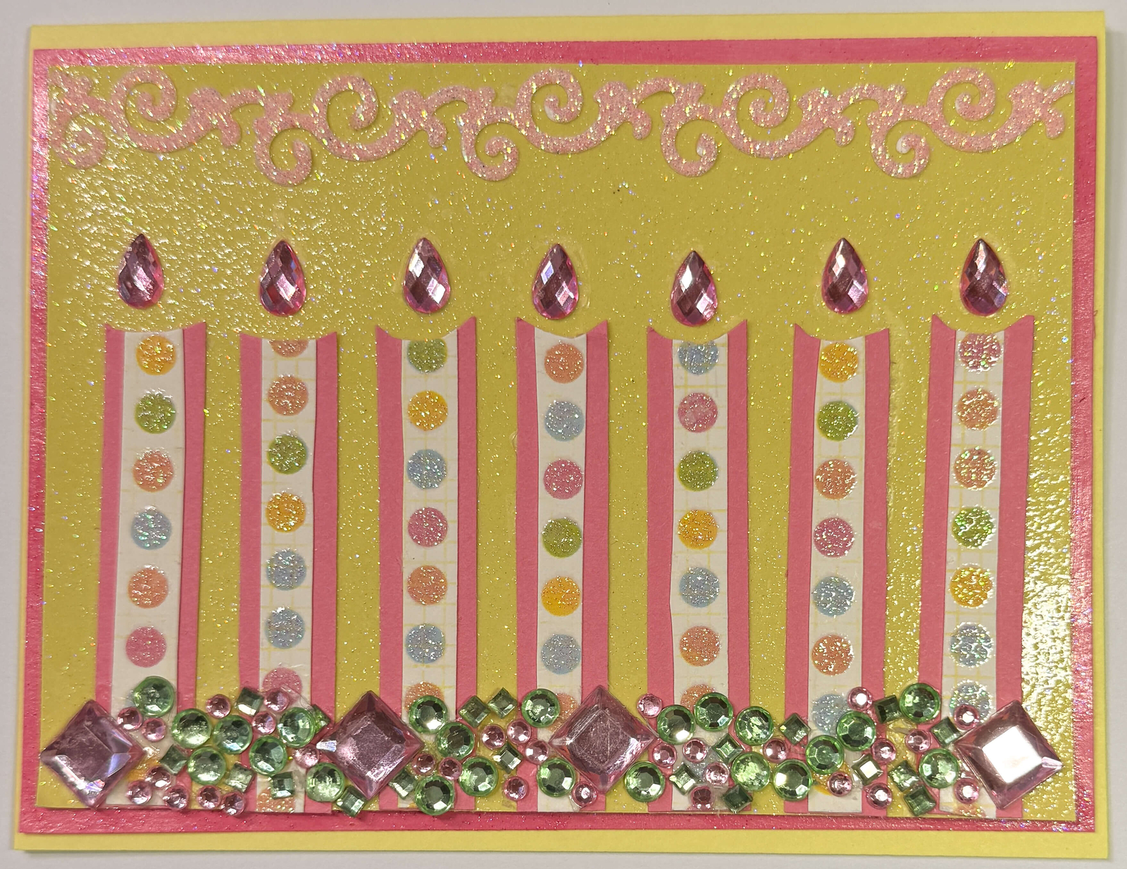 One of a Kind. Art card. Candles. Embellished. Gems. Coordinated papers. Border with gems. Frameable. Reusable. All occasion. Envelope. Blank, detachable message slip. Handcrafted in Hawai`i.