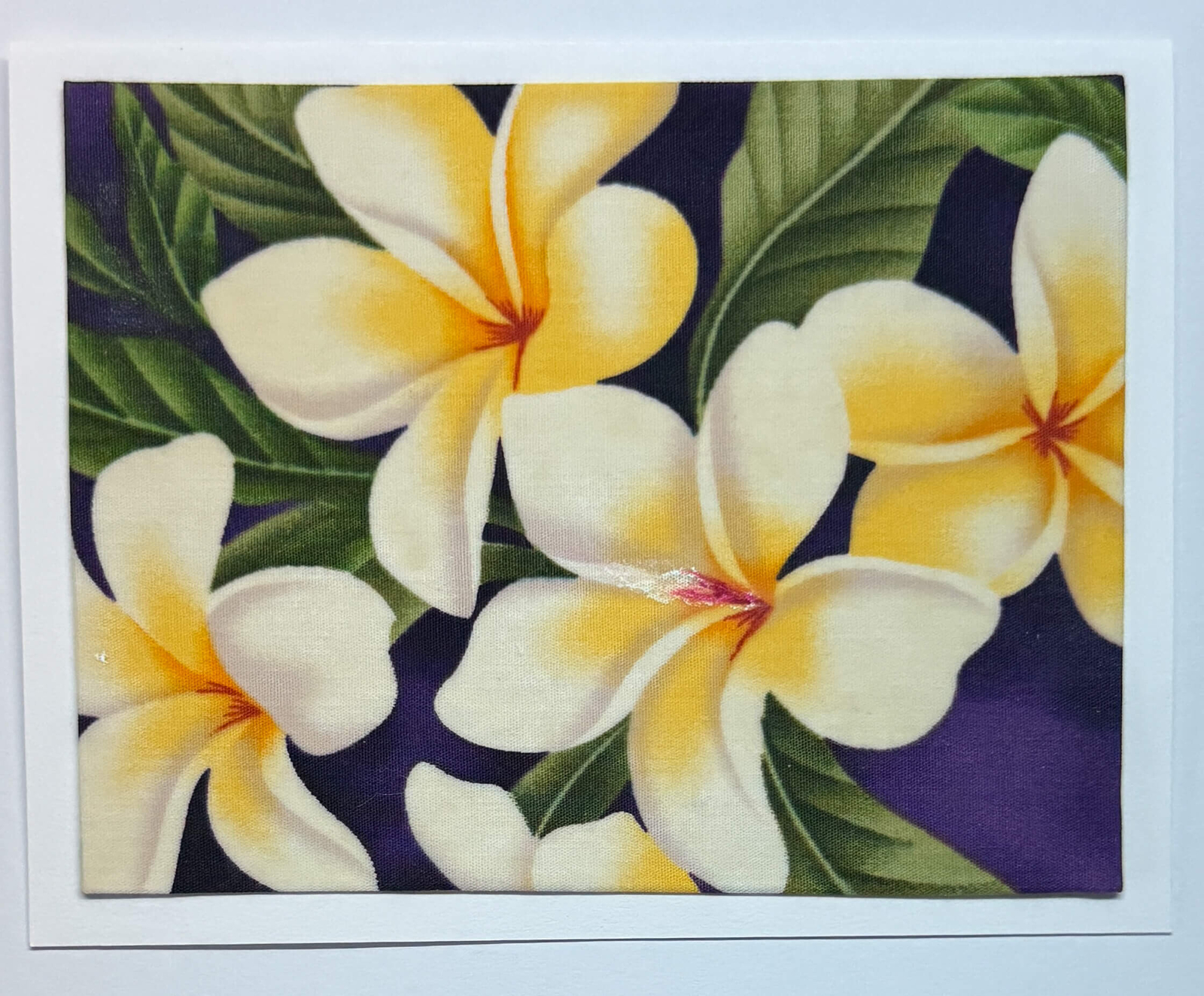 FabriCard. New Fabric. Hand-cropped. Fabric wrapped and mounted on white card stock. Frameable. Reusable. All occasion. Envelope. Blank, detachable message slip. Handcrafted in Hawai`i.