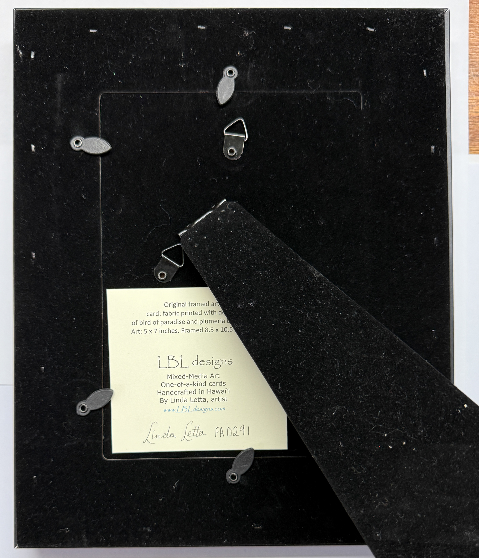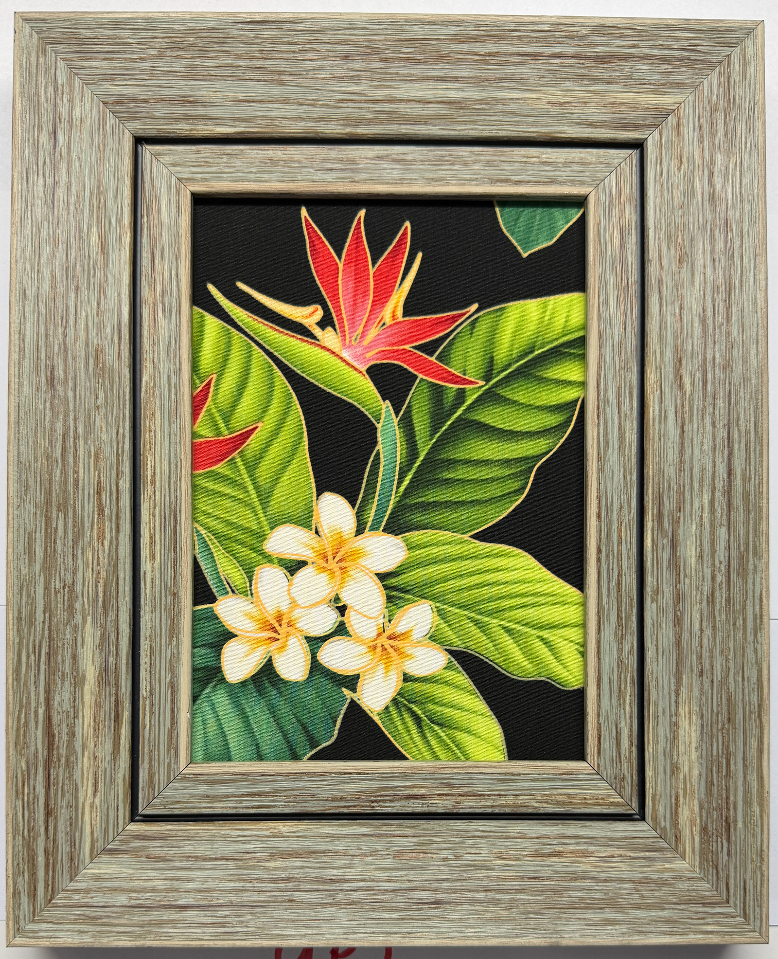 Framed art. One of a Kind. Fabric printed with design of bird of paradise and plumeria blossoms. Art: 5 x 7 inches. Framed: 8.5 x 10.5 incles.
