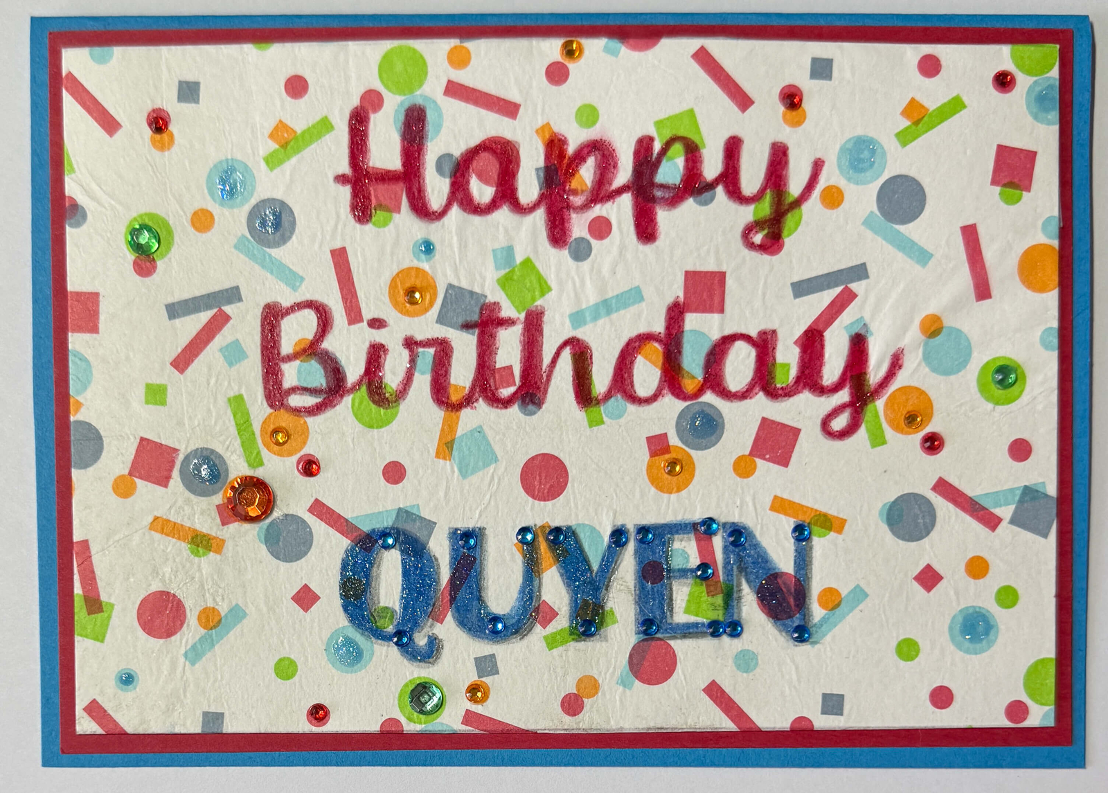 One of a Kind. Art card.Happy Birthday. Embellished. Tissue overlay. Dimensional. Frameable. Reusable. Envelope. Blank, detachable message slip. Handcrafted in Hawai`i.