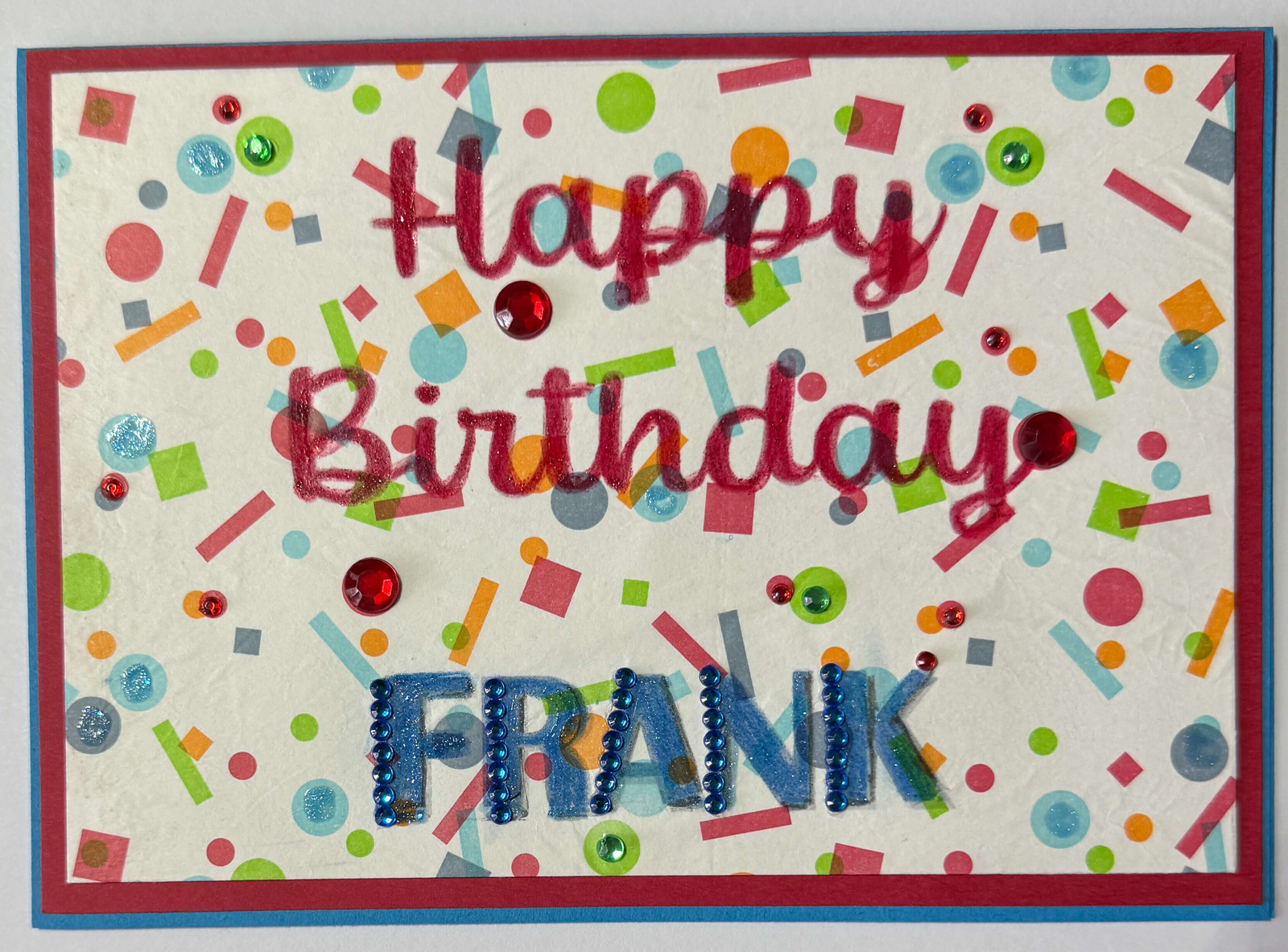 One of a Kind. Art card.Happy Birthday. Embellished. Tissue overlay. Dimensional. Frameable. Reusable. Envelope. Blank, detachable message slip. Handcrafted in Hawai`i.