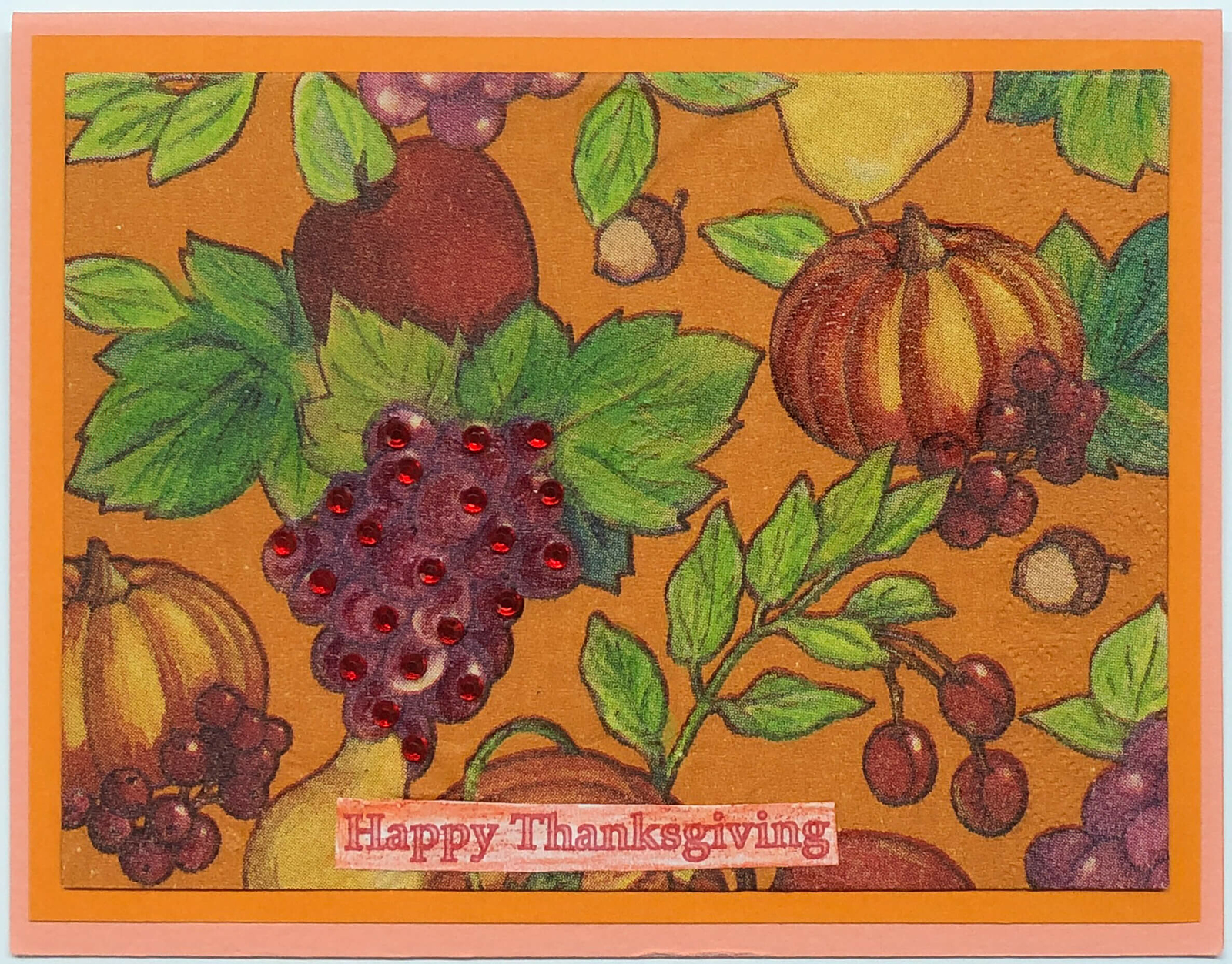 One of a Kind. Art card. Thanksgiving. Embellished, printed tissue. Colored pencil, paint, gems. Dimensional. Frameable. Reusable. All occasion. Envelope. Blank, detachable message slip. Handcrafted in Hawai`i.