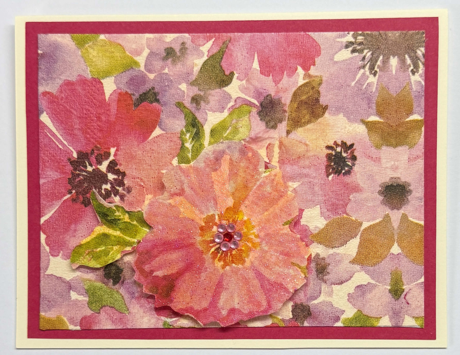 Tropical Impression. Art Card. Hawai`i inspired designs. Embellished. Mounted on card stock. Printed tissue or fabric. Frameable. Reusable. All occasion. Envelope. Blank, detachable message slip. Handcrafted in Hawai`i.